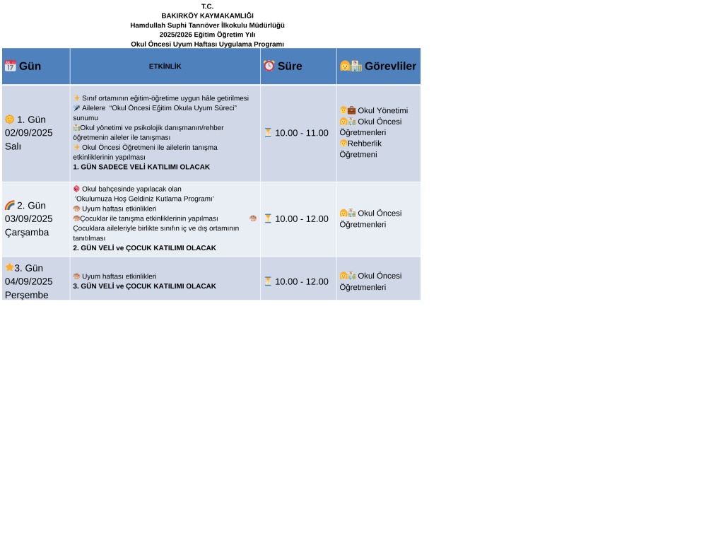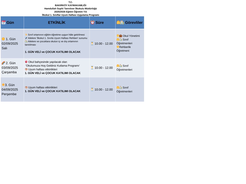2025 -2026 EĞİTİM ÖĞRETİM YILI İLKOKUL 1. SINIF ve OKUL ÖNCESİ UYUM HAFTASI UYGULAMA PROGRAMLARI