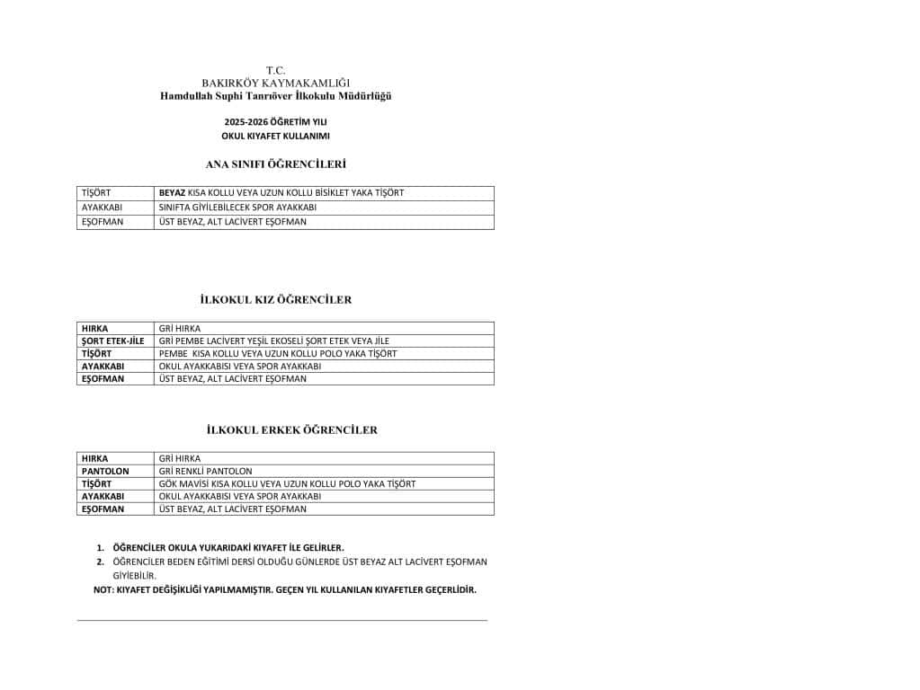 2025 / 2026 EĞİTİM-ÖĞRETİM YILI OKUL KIYAFET KULLANIMI