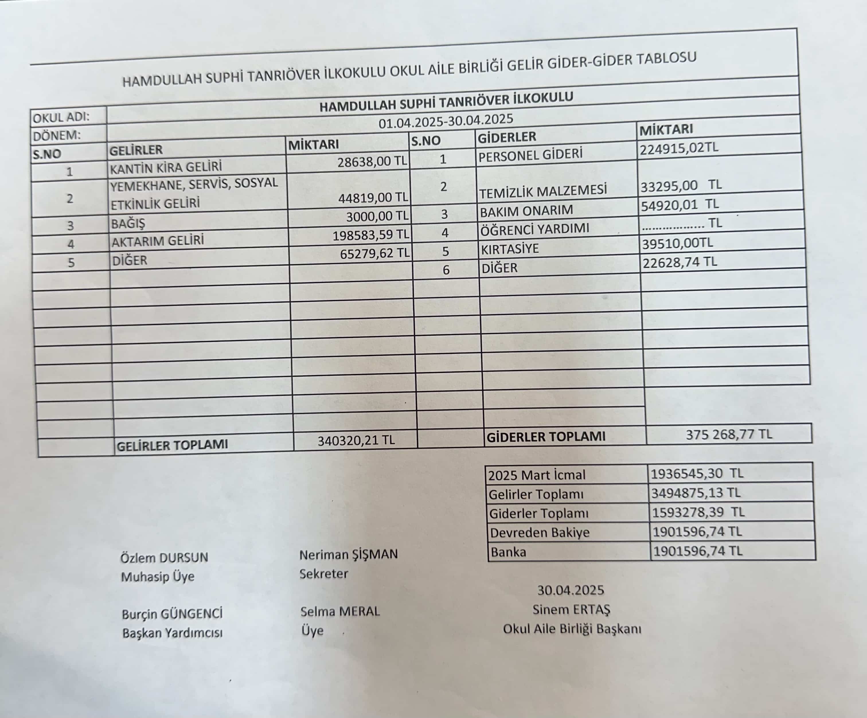 OKUL AİLE BİRLİĞİ MAYIS 2025 GELİR GİDER