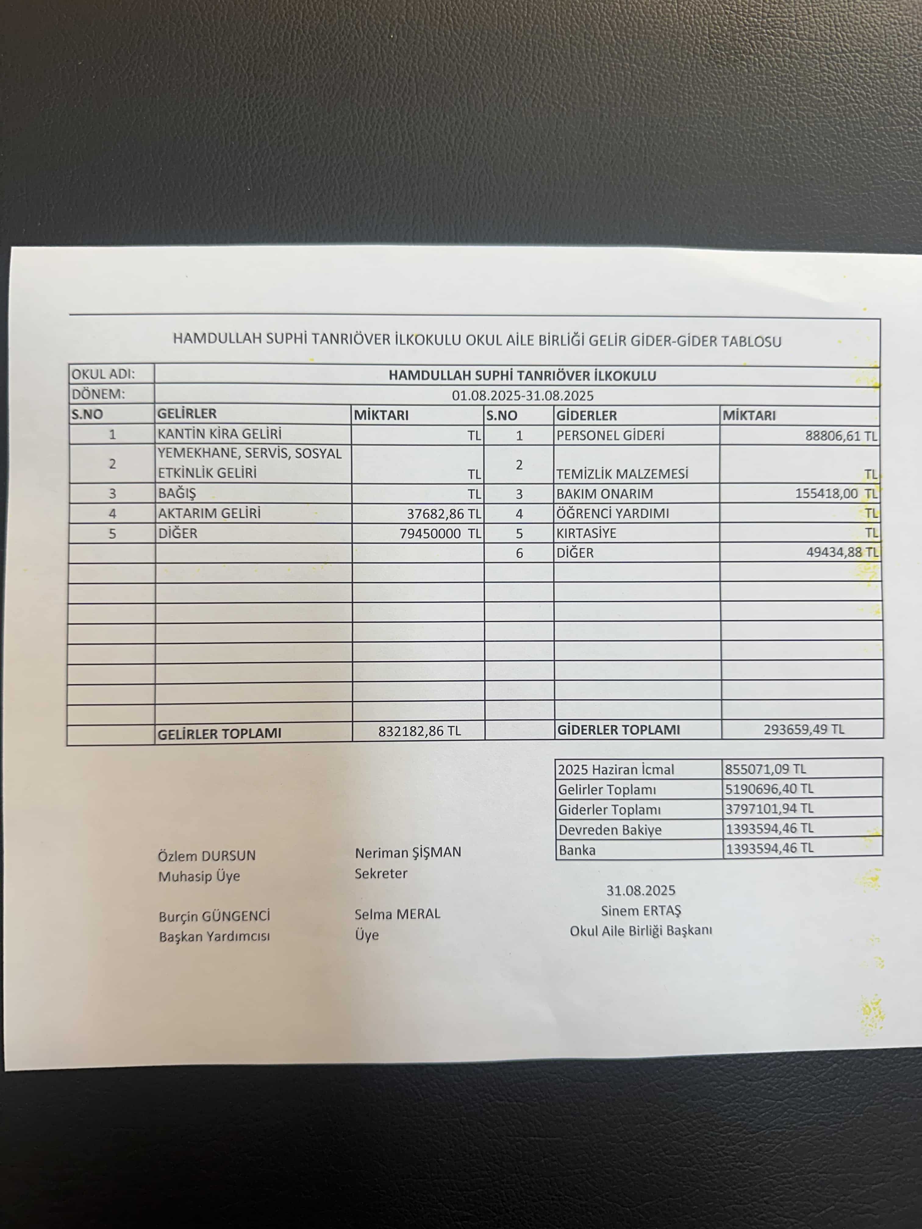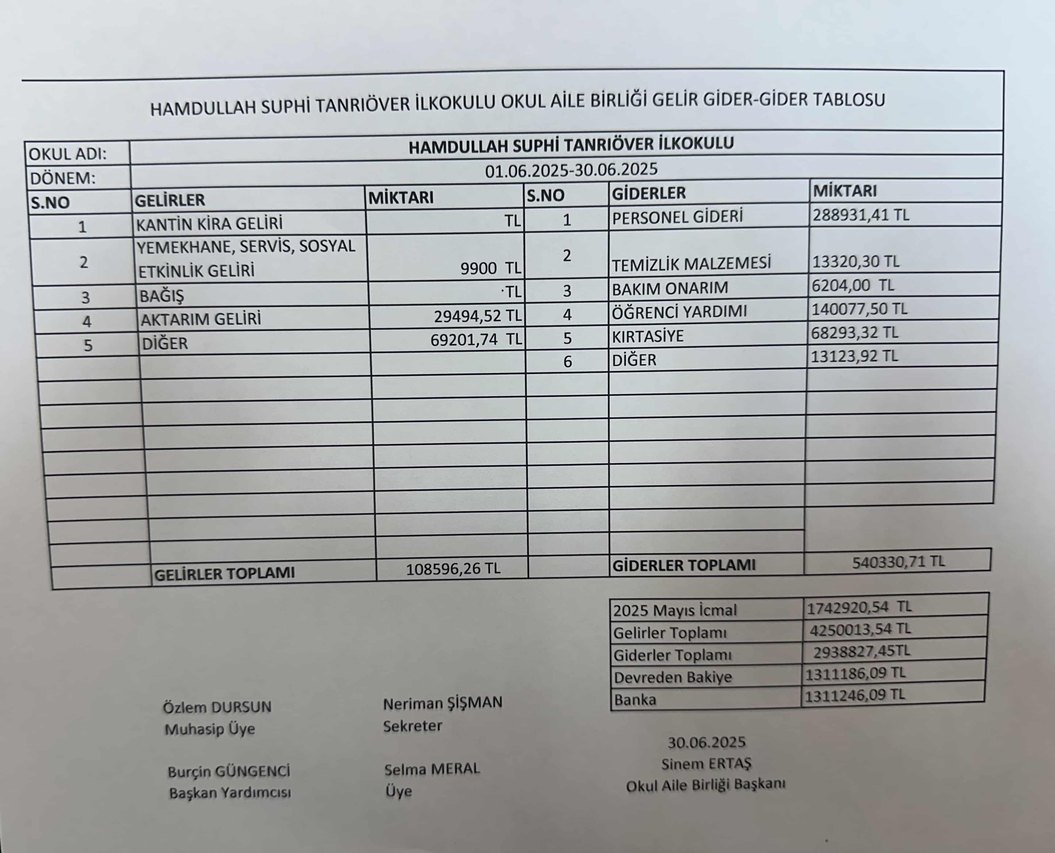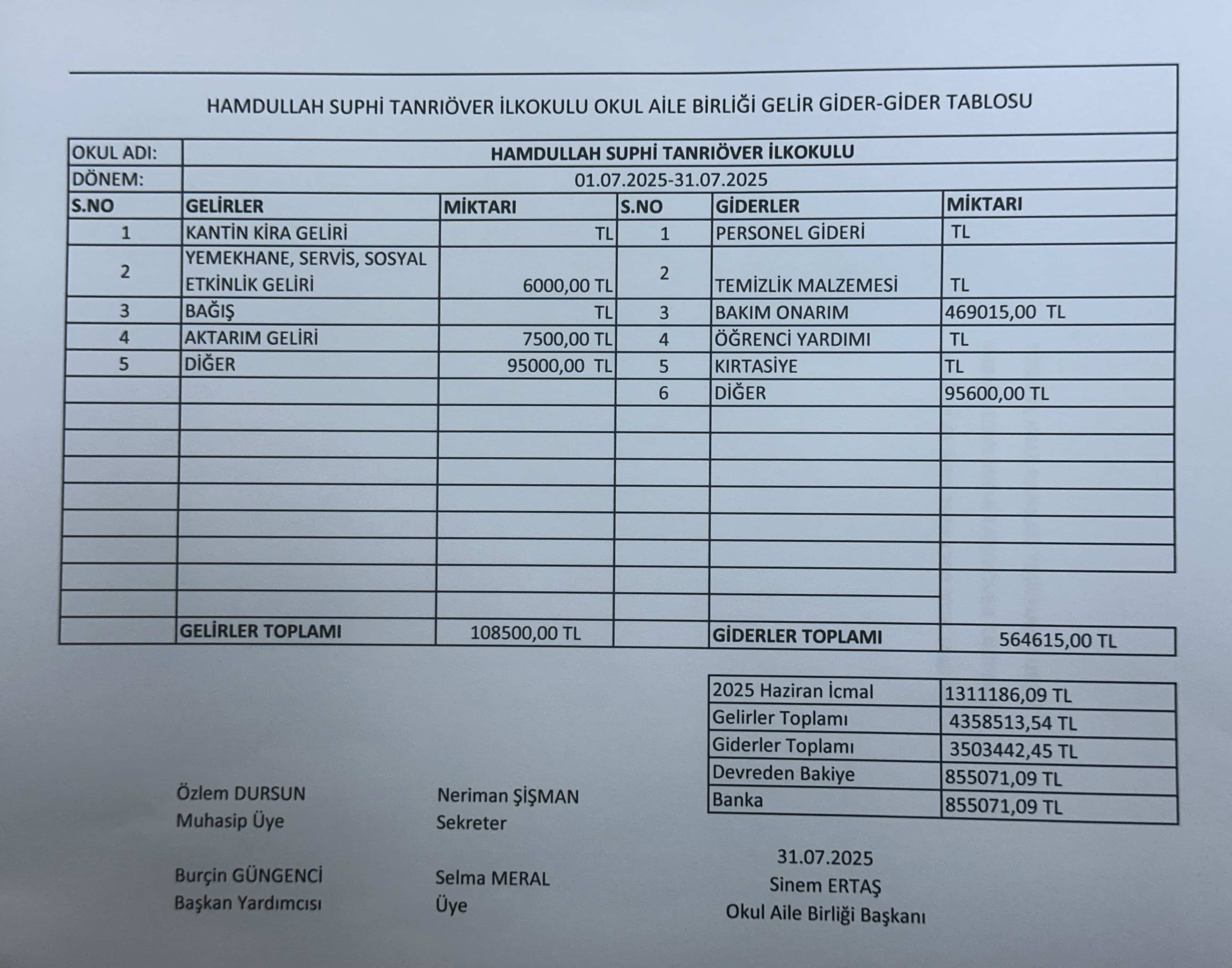 TEMMUZ 2025 OKUL AİLE BİRLİĞİ GELİR GİDER